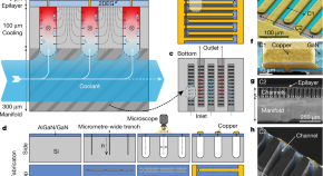 Cooling efficiency is greatly increased by directly embedding liquid cooling into electronic chips, using microfluidics-based heat sinks that are designed in conjunction with the electronics within the same semiconductor substrate.