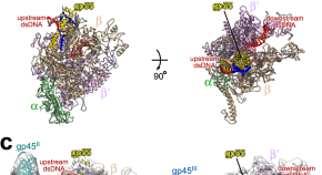 Transcription activation of late genes in T4 bacteriophage requires the promoter specificity factor gp55, the coactivator gp33 and the sliding clamp gp45. Here, the authors provide structural insights into gp45- dependent transcription activation by determining the cryo-EM structures of a gp55-dependent RNA polymerase (RNAP)-promoter open complex and of an intact gp45-dependent transcription activation complex.