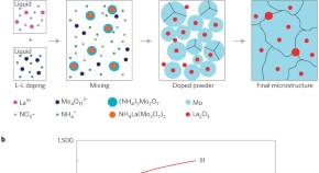 A nanostructuring processing route that leads to submicrometre grains and nanometric oxide particles uniformly distributed within the grains' interior is used to fabricate molybdenum alloys that have both exceptional high strength and ductility at room temperature.