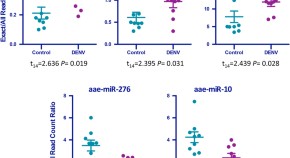 Perdomo et al. fed mosquitos (Aedes aegypti) a diet spiked with human blood miRNA, hsa-miR-21-5p and used proteomics analysis to show differential protein expression in female Ae. aegypti mosquitoes after feeding. They showed that hsa-miR-21-5p positively regulated vitellogenin, which plays a role in egg production, thus could have effects on Ae. aegypti progeny production.