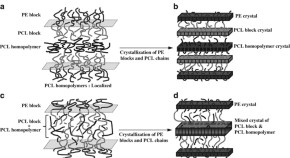 We examined the crystallization behavior of poly(ɛ-caprolactone) (PCL) chains in binary blends of PCL-block-polyethylene copolymers and PCL homopolymers using synchrotron SAXS/WAXD. When PCL homopolymers were localized between PCL blocks in lamellar microdomains (dry brush), the crystallinity of PCL chains showed a composition-dependent increase, suggesting the formation of separate PCL lamellar crystals. When PCL homopolymers were uniformly mixed with PCL blocks (wet brush), the time evolution of crystallinity was identical to that of PCL blocks, indicating the formation of a mixed crystal of PCL blocks and PCL homopolymers.