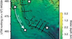 Giant submarine gravity flows are a key mechanism in global sediment transport, yet their properties remain enigmatic. Here, the authors reconstruct the properties of a historic giant submarine gravity flow from deposits across the seafloor.