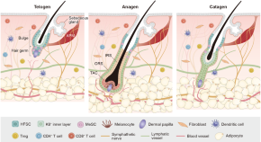 Stress inhibits hair growth in mice through the release of the stress hormone corticosterone from the adrenal glands, which inhibits the activation of hair follicle stem cells by suppressing the expression of a secreted factor, GAS6, from the dermal niche.