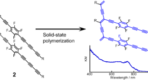 10,10′-(1,4-Phenylene)bis(5,7,9-decatriynyl N-(butoxycarbonylmethyl)carbamate) 1 and its perfluorophenylene derivative 2 were synthesized. Upon UV irradiation, both of them showed excitonic absorption of polydiacetylene. In particular, 2 showed an absorption maximum at 743 nm, which was approximately 100 nm longer than that of conventional polydiacetylenes, and its solid-state polymerization scheme was investigated.