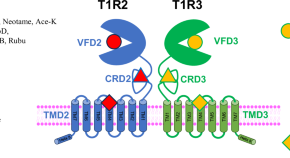Sucrose and other non-caloric sweeteners can bind to different domains of the heterodimeric sweet taste receptor (T1R2/T1R3), resulting in different levels of sweetness. Here, the authors investigate the binding mechanism of various steviol glycosides, artificial sweeteners, and a negative allosteric modulator (lactisole) at four distinct binding sites of T1R2/T1R3 through binding experiments and computational docking studies, revealing multiple binding sites for the tested ligands and structural– function correlations of ligand–receptor interactions.