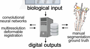 The microanatomy of the axonal projections of olfactory sensory neurons from the olfactory epithelium to the olfactory bulb in a human enbloc specimen is visualized in a 3D reconstruction assembled by deep learning and high performance computing.