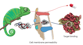 Molecular chameleons adapt their conformations to the properties of the environment so that polar functionalities are dynamically shielded or exposed. This allows chameleons to display both high cell permeability and aqueous solubility, and to bind to their drug targets.