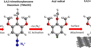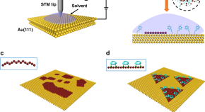 • The strong electric field between the tip of a scanning tunneling microscope and graphite has been used to modulate the two-dimensional polymerization of aryl boronic acids. Here, the authors study the influence of solvent choice and monomer concentration on the electric field-mediated polymerization and depolymerization of a boroxine-based 2D polymer on graphite.