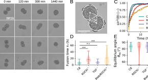 • Combining microscopy and modeling, the authors reveal that tissue fluidity, driven by active cell motion and interfacial tension, governs how living spheroids merge into larger structures.