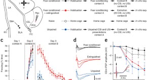 The mechanisms underlying fear extinction remain unclear. Here, the authors show that extinction enhances basolateral amygdala inputs about conditioned stimuli to intercalated cells, resulting in the inhibition of fear output central amygdala neurons. These changes required medial prefrontal activity during extinction training, but, once induced, could be expressed without prefrontal inputs.