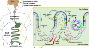 The gastrointestinal tract participates in maintaining metabolic homeostasis in part through nutrient-sensing and subsequent gut-brain signalling. Here the authors review the role of small intestinal nutrient-sensing in regulation of energy intake and systemic glucose metabolism, and link high-fat diet, obesity and diabetes with perturbations in these pathways.