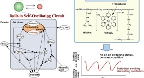 • To obtain a novel biomimetic polymer, we have been studying polymers with an autonomous self-oscillating function. We succeeded in developing a novel self-oscillating polymer and gel by using an oscillating reaction, called the Belousov–Zhabotinsky (BZ) reaction, which is recognized as a chemical model for understanding several autonomous phenomena in biological systems. The self-oscillating polymer is composed of a poly(N-isopropylacrylamide) network in which the catalyst for the BZ reaction is covalently immobilized. Under the coexistence of the reactants, the polymer undergoes spontaneous cyclic soluble–insoluble changes or swelling–deswelling changes (in the case of gel) without any on–off switching of external stimuli. Several kinds of functional material systems using the self-oscillating polymer and gel, such as biomimetic actuators, mass transport surface and so on, are expected.