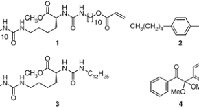• Nematic liquid-crystalline (LC) gels showing electrooptical switching have been prepared for the mixtures of a new polymerizable lysine-based gelator and a nematic LC compound, 4-cyano-4′-pentylbiphenyl. Finely dispersed fibrous networks are formed by self-assembly of the gelators through the formation of hydrogen bonds. In-situ photopolymerization of the gelators in the self-assembled state leads to thermal stabilization of the fibrous network structures. The threshold voltage of electrooptical switching for the polymerized LC gel is lower than that for non-polymerized LC gels.