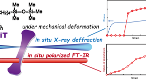 For the development of wearable and stretchable devices, stretchable and flexible semiconductive materials are desired. To understand the mechanical behavior of structural deformation of polythiophene with disiloxane groups, we performed in situ measurements under stretching using X-ray diffraction of synchrotron radiation and polarized infrared spectroscopy. The behaviors of amorphous region was oriented during the initial deformation, while the orientation of crystallites began after permanent set.