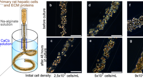 Macroscopically long, cell-encapsulating, core–shell hydrogel microfibres that can be assembled into macroscopic cellular constructs by weaving and reeling are shown to reconstitute intrinsic morphologies and functions of living tissues. When transplanted into the subrenal capsular space of diabetic mice, the microfibres normalize blood glucose concentrations for about two weeks and can later be removed.