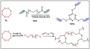 • Inverse vulcanization (IV) generates sulfur-rich functional polymers from elemental sulfur and organic crosslinkers, but the harsh reaction conditions required limit the scope of suitable crosslinkers. Now, a photoinduced IV has been shown to proceed at ambient temperatures, enabling the use of volatile and gaseous alkenes and alkynes as crosslinkers and broadening the range of products.