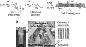 • Cellulose-based hydrogels have attracted much attention due to their potential for a wide variety of applications. Recently, we demonstrated the production of nanoribbon network hydrogels through a crystallization-driven self-assembly of cellulose oligomers synthesized by enzymatic reactions under macromolecular crowding conditions. However, the detailed mechanism underlying hydrogel production remains unclear. This study investigated the effect of solution viscosity on hydrogel production by using a highly branched polymer, Ficoll. We propose that a certain level of solution viscosity is an essential requirement for hydrogel production.