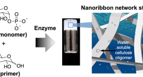 • Cellulose oligomers were synthesized via cellodextrin phosphorylase-catalyzed reactions using α-D-glucose 1-phosphate monomers and D-glucose primers. The products prepared at relatively high primer concentrations self-assembled into highly grown nanoribbon network structures. The nanoribbons were composed of cellulose oligomers with degree-of-polymerization (DP) values of 8-9 with certain degrees of DP distribution and displayed the cellulose II allomorph. A formation mechanism for the unique nanostructures was proposed based on analyses of reaction time-dependent differences of the product solutions.
