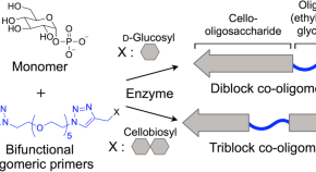 • Block co-oligomers have gained attention for fine and precise control of self-assembled nanostructures. In this study, we investigated the enzyme-catalyzed synthesis of block co-oligomers composed of cello-oligosaccharide and oligo(ethylene glycol) (OEG) chains. The propagation of cello-oligosaccharide chains from bifunctional OEG primers with d-glucose or cellobiose ends, namely, glycosyl acceptors was systematically analyzed. It was plausible from systematic characterizations that diblock and triblock co-oligomers were produced by using the respective primers.