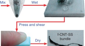 The use of spider silk in electronic devices is dependent on its compatibility with electrically conductive materials. Here the authors modify spider silk with carbon nanotubes to produce a strong, flexible and electrically conductive thread.