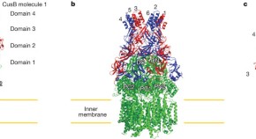 Gram-negative bacteria expel toxic chemicals via tripartite efflux pumps spanning both the inner and outer membranes. A crystallographic model of this tripartite efflux complex has been unavailable because co-crystallization of different components of the system has proven to be extremely difficult. The X-ray crystal structure of CusA of the CusCBA tripartite efflux system from Escherichia coli has been reported previously, and here the X-ray crystal structure of the CusBA co-complex is reported. The structure reveals that the trimeric CusA efflux pump interacts with six CusB protein molecules at the upper half of the periplasmic domain, and the predicted structure of the trimeric CusC channel was used to develop a model of for the tripartite efflux complex.