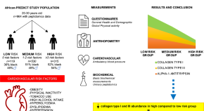 This study included 964 apparently healthy (no self-reported chronic illnesses, free from clinical symptoms of CVD) black and white men and women (aged 20–30 years old) from the African-PREDICT study. Cardiovascular risk factors used for stratification included obesity, physical inactivity, tobacco use, high alcohol intake, hyperglycemia, dyslipidemia and hypertension. Participants were divided into low (0 risk factors), medium (1–2 risk factors) and high (≥3 risk factors) CV risk groups. We found lower abundances of collagen type I and III derived peptides in the high compared to the low cardiovascular risk group, which may suggest early alterations in the cardiovascular extracellular matrix.
