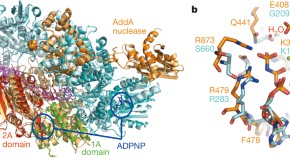 A dual-function helicase–nuclease, typified by RecBCD in Escherichia coli, acts on free DNA ends during bacterial double-stranded break repair until it reaches a χ sequence at which it pauses before continuing with modified enzymatic properties; here several crystal structures of the related AddAB enzyme from Bacillus subtilis bound to χ-containing DNA are presented, offering insight into χ recognition and its effect on DNA translocation.