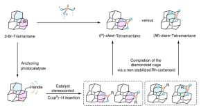 skew-Tetramantane—diamond’s chiral core—previously only accessible from fossil fuels after elaborate separations, was selectively synthesized by a combination of visible-light photocatalytic reactions to modulate radical chemistry and catalyst-controlled C–H insertions. Operating under kinetic control, this stereoselective adamantalogous cage-extension strategy provides access to synthetic diamondoids beyond adamantane, diamantane and triamantane.