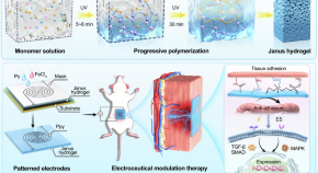 Janus hydrogel bioelectronic interfaces are challenged by complex fabrication, poor tunability of asymmetric properties and weak interlayer bonding strength. Here, the authors create a Janus hydrogel with dual structural and compositional gradients in one step via molecular competition induction mechanism.