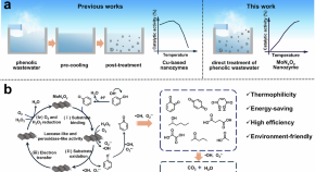 Nanozymes have been identified as suitable candidates for pollutant degradation, but their thermoresponsive catalytic properties remain underexplored. Here, the authors report a MoNxOy nanozyme composed of Mo5N6 and MoO2 crystalline phases and apply it to catalyze the degradation of phenolic pollutants at high temperature, observing an increase in laccase-like and peroxidase-like activities up to 90 °C.