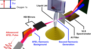 • Water-vapor interfaces have been studied with many techniques, yet open questions persist about their electronic and molecular structure. Here, the authors demonstrate the application of soft x-ray second harmonic generation to study the water surface by leveraging attosecond pulses at the LCLS and a flat liquid sheet microjet, providing insights on the H-bond structure.