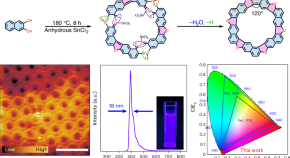 • Planar oxygen-doped carbon quantum rings (OD-CQRs) are prepared through one-pot solid-state reactions. The synthesized OD-CQRs exhibit a fluorescence peak centre at 393 nm, a full-width at half-maximum of 18 nm and a photoluminescence quantum yield of 95%. Electroluminescent light emitting diodes based on OD-CQRs demonstrate high-colour-purity violet emission.
