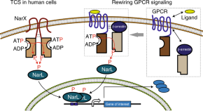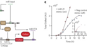 Engineering gene expression systems that can be programmed to respond to specific environmental conditions is challenging. Here, the authors develop a synthetic bow-tie circuit that is able to sense signals from microRNA molecules and affect a change in protein dynamics in mammalian cells.