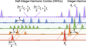 Mechanical frequency combs are promising for precision measurements, sensing, and metrology blew Gigahertz. Here, authors introduce a magneto-mechanical frequency comb including its integer- and half-integer-harmonic combs via magnetostrictive effect with the teeth spacing that can be continuously tuned.