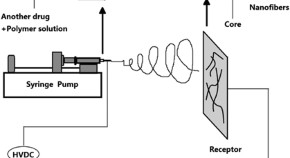 Electrospun composite nanofibers containing nanoparticles were fabricated through a one-step, single-nozzle electrospinning technique. The nanoparticles were linearly packed as a string along the axes of the fibers, forming core–shell structure. Loading different drugs in core and shell provided distinct release behaviors at the same time.
