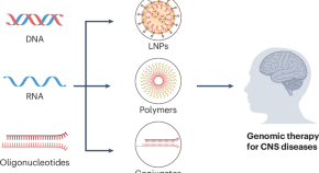 Genomic therapy offers a promising strategy for addressing central nervous system disorders. This Review highlights recent advances in chemical strategies and delivery platforms, such as lipid nanoparticles, polymers and oligonucleotide conjugates, and it discusses future directions to improve the application of genomic therapy in brain disorders.