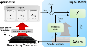 Fushimi and colleagues report a digital twin based method to correct the discrepancies between simulation and experimental states for acoustic hologram optimization. This method reduces the number of experimental measurements needed, thus more efficient as compared to classical finite difference based approaches.