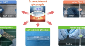 Owing to both solid- and liquid-like nature, gels are unique smart materials with several potential applications. However, most gels are inherently susceptible to harsh environments. Inspired by the “tun forming mechanism” of tardigrades, we proposed a simple two-step process to fabricate extremotolerant glycerogels with extremoprotected polymer-glycerol networks, which can survive from −50 to 80 °C for prolonged periods. The method is applicable to various types of polymers and crosslinkers and can be integrated with various functional materials to realize glycerogels with wide-ranging functionalities and properties. Therefore, this method dramatically enhances the selection of gels for bio, electrical/electronic, and soft robotics applications.