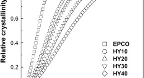 The crystallization behavior of the ethylene, propylene and carbon monoxide/thermoplastic elastomer (EPCO/HY) blends in the static and dynamic states revealed that immiscible HY retarded the crystallization of EPCO without changing its crystal structure. The large difference in the elastic moduli of the two polymers at the crystallization temperature was the principal reason for the retardation process. The retardation of crystallization could be explained by steric hindrance or a shield effect of the HY phase on the growth of EPCO spherulites at a temperature near the crystallization temperature (Tc).
