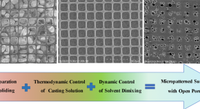 This work presents a method on tailoring open pores on the patterned surface of polyethersulfone membrane prepared by the phase separation micromolding. By modifying both the thermodynamics of the casting solution and the dynamics of solvent/nonsolvent demixing, micropatterned membrane with average surface open pores in the diameter of 1095 nm and porosity as high as 31.4% was achieved. The size and number of pores were different depending on their locations on the patterned surface, which was caused by different solvent/nonsolvent demixing dynamics resulting from the physical discontinuity of micro-patterned membranes.