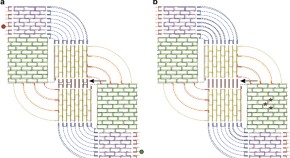 A ‘box-shaped’ three-dimensional (3D) DNA origami of ~40-nm dimensions was selectively formed by closing a symmetric open motif with three orthogonal faces. This 3D DNA origami was used as an intelligent nano-container to encapsulate exactly one 10-nm gold nanoparticle (AuNP). AuNPs were functionalized with thiol-modified DNA strands and attached to one of the faces of the open motif, which was designed to be an interior surface of the box and decorated with three complementary strands. The open motif was then closed into the box shape as triggered by the addition of DNA strands joining the remaining edges. An examination of the suitable folding path of an M13 scaffold using fluorescently labeled staple strands revealed that the flexibility at the hinge was essential for the efficient closing of the DNA origami container. Atomic force microscope and transmission electron microscope imaging of agarose-gel-purified complexes clearly showed the successful encapsulation of one AuNP inside the shell.