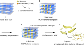 Unlike 1D and 3D-networked macromolecules, the synthesis of 2D molecular networks is challenging because of the nature of the polymerisation reaction. Here the authors report the synthesis of polymeric monosheets with unimolecularly thick networks by exploiting the 2D nanospaces of metal–organic frameworks as reaction templates.