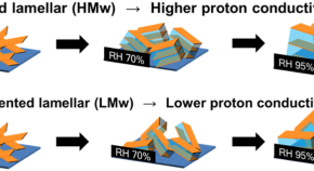 High-molecular-weight (HMw) sulfonated polyimide thin films with a semialiphatic main chain exhibited an oriented lamellar structure and high proton conductivity (1.5 × 10-1 S cm-1) under humidified conditions. Low-molecular-weight (LMw) sulfonated polyimide thin films with the same semialiphatic backbone exhibited a nonoriented lamellar structure and low proton conductivity (3.0 × 10-2 S cm-1) under humidified conditions. The results indicate that, in sulfonated polyimide thin films with semialiphatic main chain, the lamellar orientation greatly contributes to the high proton conductivity.