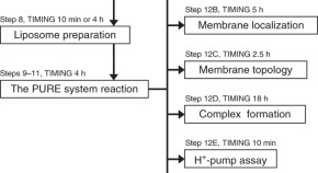 This protocol enables cell-free synthesis of membrane proteins using the PURE system, subsequent quantification of products and analyses of membrane localization efficiency, product orientation, and complex formation in the membrane.