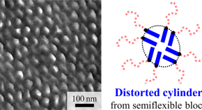 Diblock copolymers consisting of flexible polystyrene and semiflexible poly(n-hexyl isocyanate), P(S-b-HIC)s, were prepared by anionic polymerization, followed by SEC fractionation. The microphase-separated structures of two P(S-b-HIC)s with ΦPHIC = 0.18 and 0.31, were investigated by TEM, SAXS and WAXS. Both two P(S-b-HIC)s exhibited hexagonally packed cylindrical structures but different cross-sectional shapes, namely, P(S-b-HIC)-0.18 has a round-shaped cross-section, while P(S-b-HIC)-0.31 has a distorted one. The latter could originate from the liquid crystalline structures of the PHIC blocks in cylindrical domains, which align obliquely to the interface of the domains.