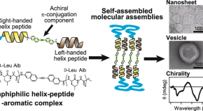 Supramolecular chiral emergence from achiral molecules is studied using newly designed amphiphilic polypeptides upon self-assembling into nanosheets and vesicles in water. The polypeptide, SL-π-D, contains a hydrophilic poly(Sar) block, two hydrophobic helical blocks, and a π-conjugate block. The helical blocks possess right- and left-handed helices, compensating for helical chirality resulting in an achiral molecule. SL-π-D self-assembled in trifluoroethanol/water solutions into uniform nanosheets and vesicles, with the Cotton effect appearing in the achiral π-conjugate block. Supramolecular chiral emergence intrinsically arises from the molecular structure and is enhanced in vesicular morphology.