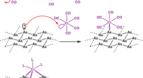 Rhombohedral (gray) arsenic represents a promising layered material for the fabrication of electronic devices and sensors; however, synthetic protocols for tuning its properties or protecting the surface by covalent functionalization are not known. In this communication, we present its covalent functionalization accompanied by exfoliation of rhombohedral arsenic in the presence of chromium hexacarbonyl and UV irradiation. Under such conditions, arsenic atoms act as ligands to the chromium metal center. We believe that this approach will open the doors for next modifications of rhombohedral few-layer arsenic and enable its application in variable fields including electronic devices, sensors, and energy devices.