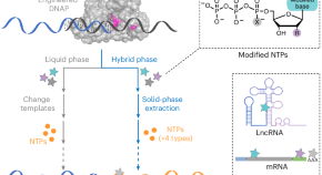 The demand for large, position-specific modified RNA molecules is high across diverse fields. Now a DNA polymerase has been engineered to enable the efficient and flexible synthesis of such molecules using a pause–restart strategy. This methodology can be implemented in both liquid and hybrid solid–liquid phases.