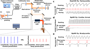 Men et al. develop an optogenetic pacing tool to control Drosophila heart rhythm noninvasively with red light. Using optical coherence microscopy imaging, they demonstrate effective light-induced tachypacing, bradypacing, and restorable cardiac arrest in transgenic fly models. This study provides a user-friendly research platform for noninvasive cardiac optogenetic studies.