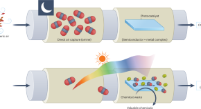 Photocatalytic conversion of CO2 typically requires a concentrated gas stream, making direct conversion of atmospheric CO2 to value-added products a challenge. Now, researchers report a photocatalytic reactor to produce useful molecules directly from air-captured CO2 using solar energy.